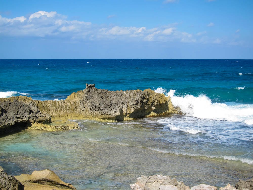 Once refreshed, we walked around the point, climbing on craggy rocks, and watching the boisterous tides crashing in. We followed the shoreline for awhile, and came upon some buildings that had been hit by a hurricane. The cement walls remained intact, but the roofs and insides were gutted. They appeared to be abandoned, which wasn’t surprising.