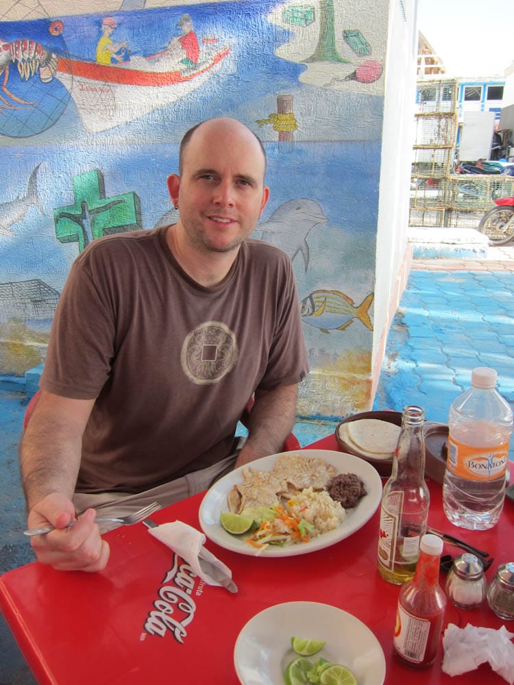 We walked inland and crossed the tiny island within a few minutes, with the intention of walking south. Just south of the ferry landing we noticed a quaint restaurant offering seafood tacos. Dining in the shade, we enjoyed garlic fish, cervesa and veggies, lingering for awhile in the gentle breeze.