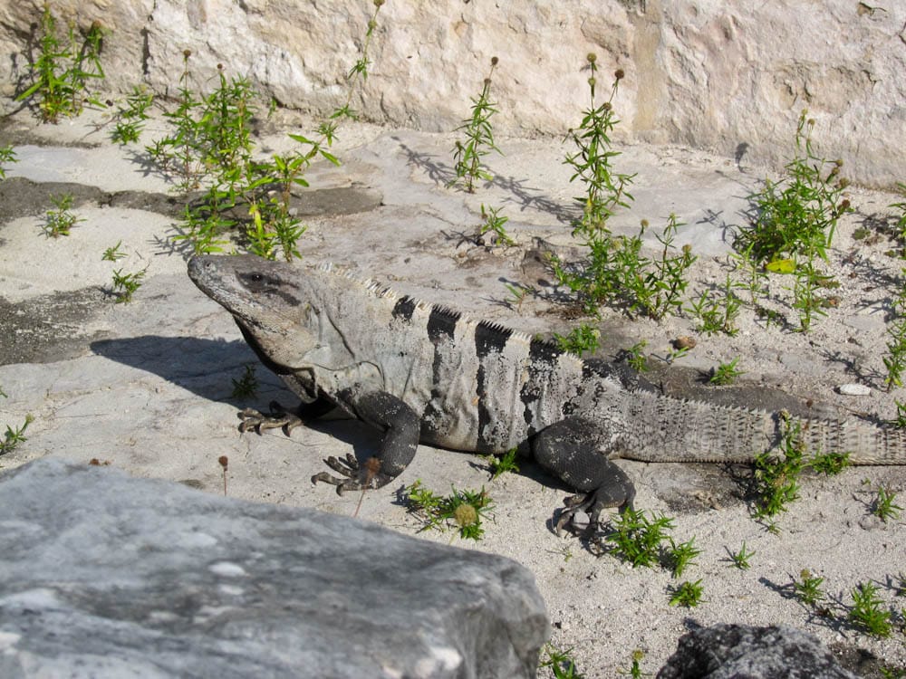 The bus dropped us off just outside the entry to the small Mayan archeological site, and I was excited to return there after our first visit six years ago. At the well-kept entrance, we paid the $37 pesos (about $3.10 U.S.D.) and I immediately started looking for the iguanas – which I knew would be basking on the stones like sunbathers.